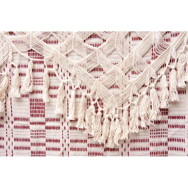 João, nuestro maestro tejedor, anuda a mano hasta 6.000 hilos longitudinales por hamaca. La hermosa apariencia bohemia de la hamaca de Río es creada por la artesanía tradicional del macramé que se utiliza para la tradicional cenefa ornamental anudada a mano (veranda). Los dos extremos del tejido también se anudan cuidadosamente tiger a mano con macramé*, que se teje en la banda de algodón. Los extremos del macramé se utilizan para hacer ojales estables para las cuerdas colgantes.
